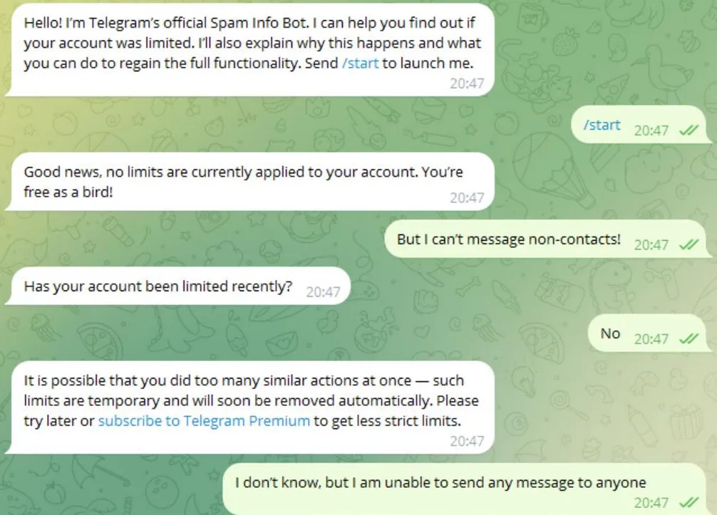 Telegram账号被限制私信功能通常是因为触发了反垃圾信息风控。您可以通过官方Spam Info Bot提交申诉解决,这是最直接有效的解决方式,只需按照指引诚恳说明情况,大多数用户可在24-48小时内恢复正常;如果申诉失败,可尝试开通会员或建立双向联系来逐步恢复账号权重。